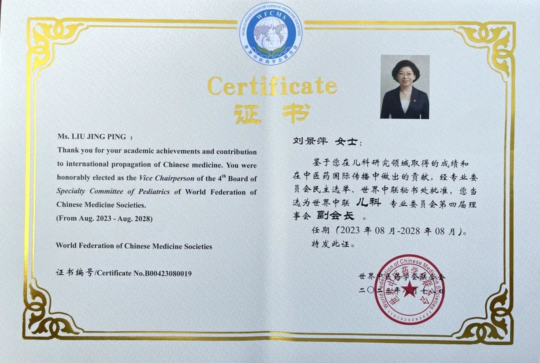 EBpay药业集团党委书记、董事长刘景萍当选世界中医药学会联合会儿科专业委员会第四届理事会副会长